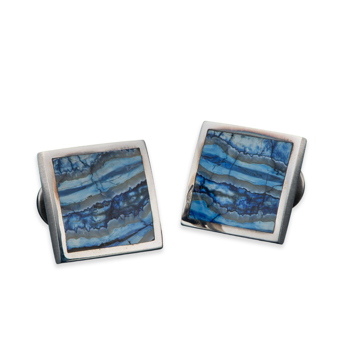 This set of fine sterling silver cufflinks showcase stunning inlays of blue fossil Wooly Mammoth tooth that is over 10,000 years old. William Henry's fossil Mammoth tooth is harvested in Alaska and Siberia – a rare and mesmerizing material, it is a living testimony of the dawn of Mankind.