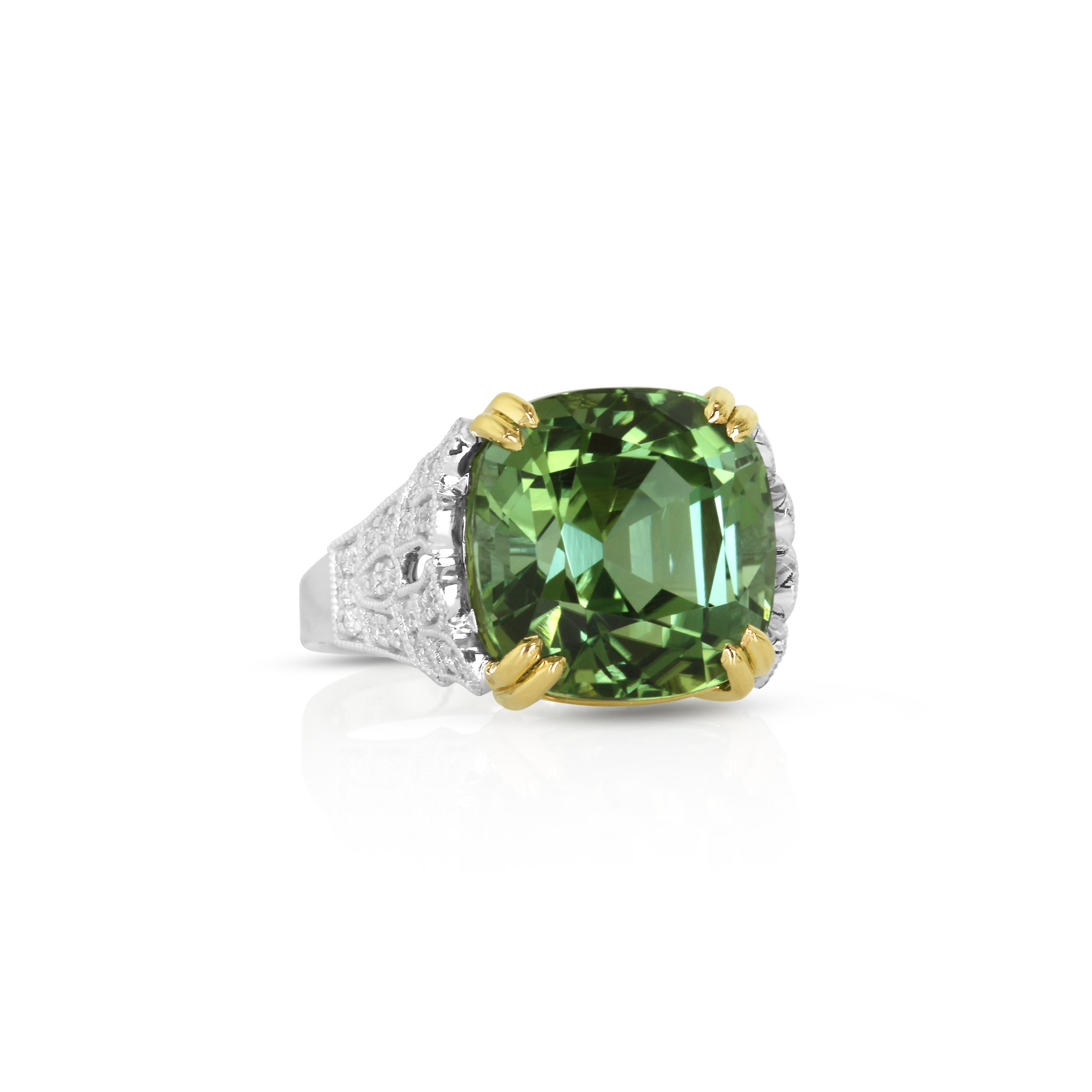 18K White and Yellow Ring with 13.80ct Green Cushion Shape Tourmaline 0.32ctw Round Diamonds