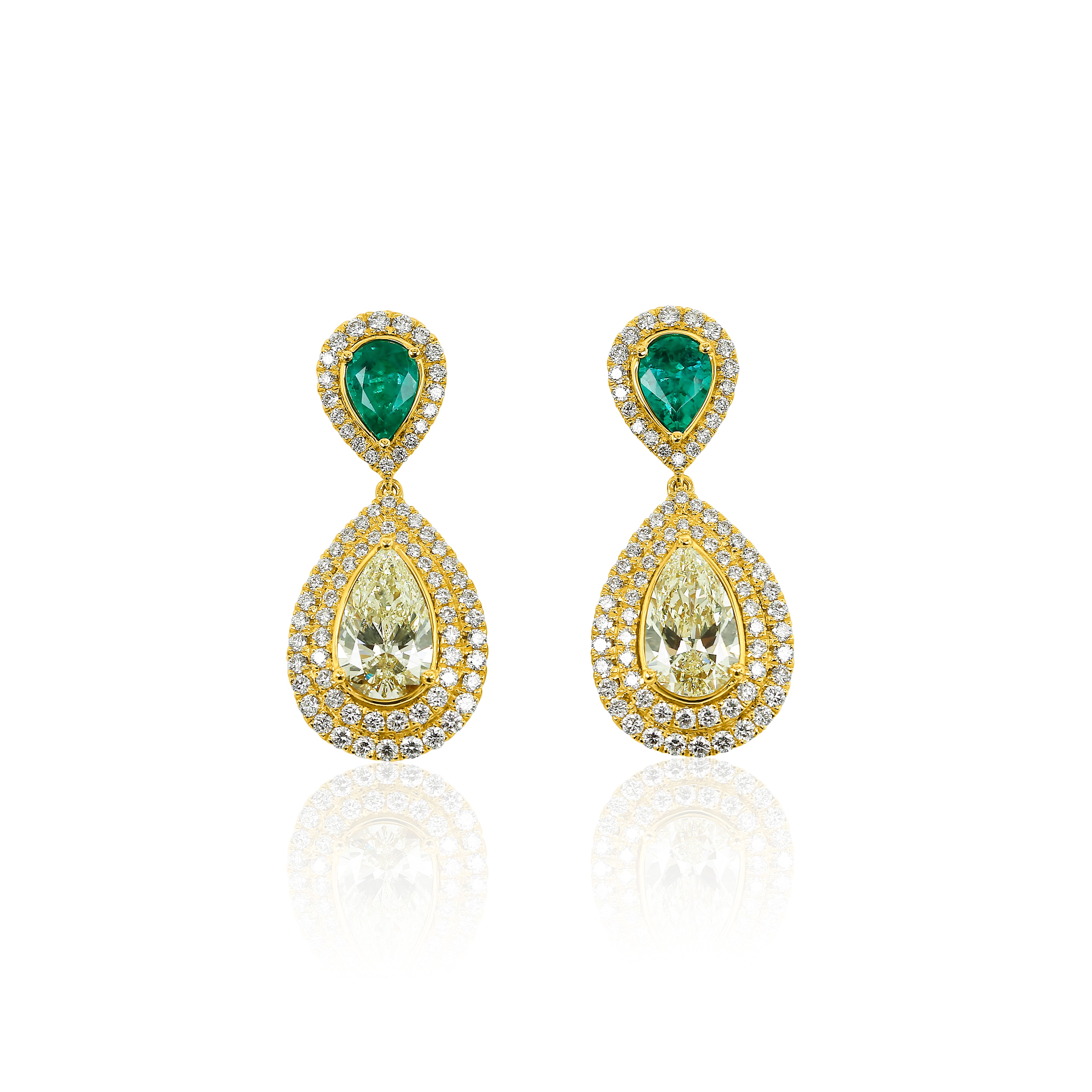 18K Yellow Gold Diamond Drop Earrings with 3.06ctw Pear Shape Yellow Diamonds, 1.18ctw Pear Shape Emeralds, and 1.37ctw Round Diamonds