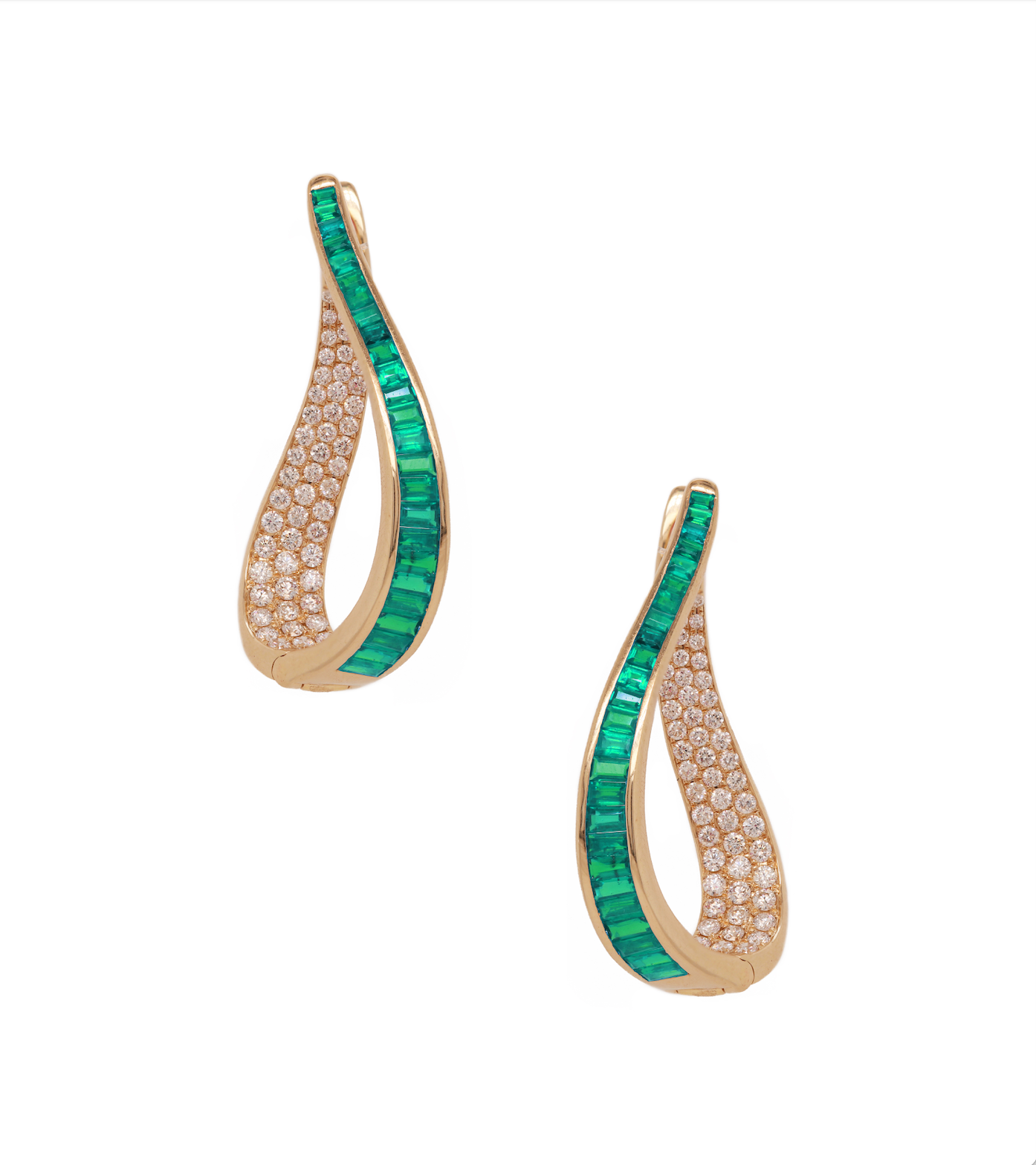 Yellow Gold Emerald and Diamond Hoop Earrings