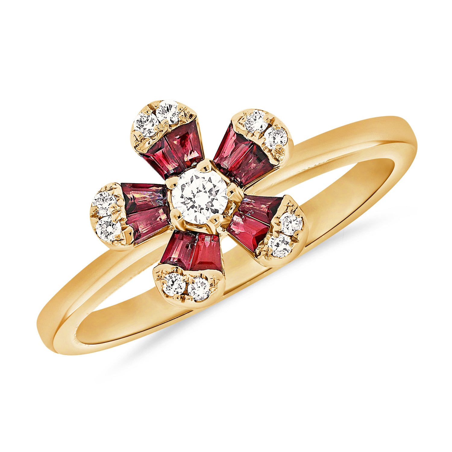 14K Yellow Gold Flower Ring with 0.69ct Baguette Rubies and 0.28ctw Round Diamonds